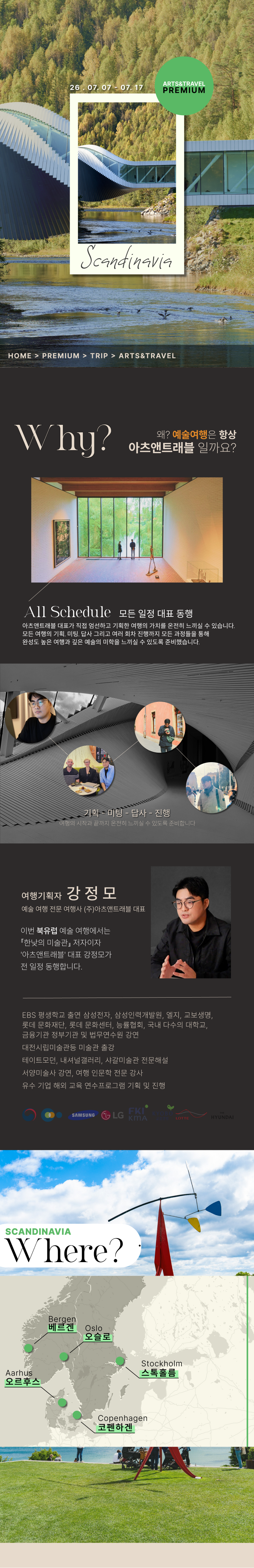 '아츠앤트래블 스칸디나비아 3국(덴마크, 노르웨이, 스웨덴) 예술 여행'은 아름다운 북유럽의 대자연을 만끽하며 올라퍼 엘리아슨, 뭉크, 빌헬름 함뫼르쇼이, 칼 라르손과 같은 예술가들의 작품을 감상하는 특별한 여정입니다.